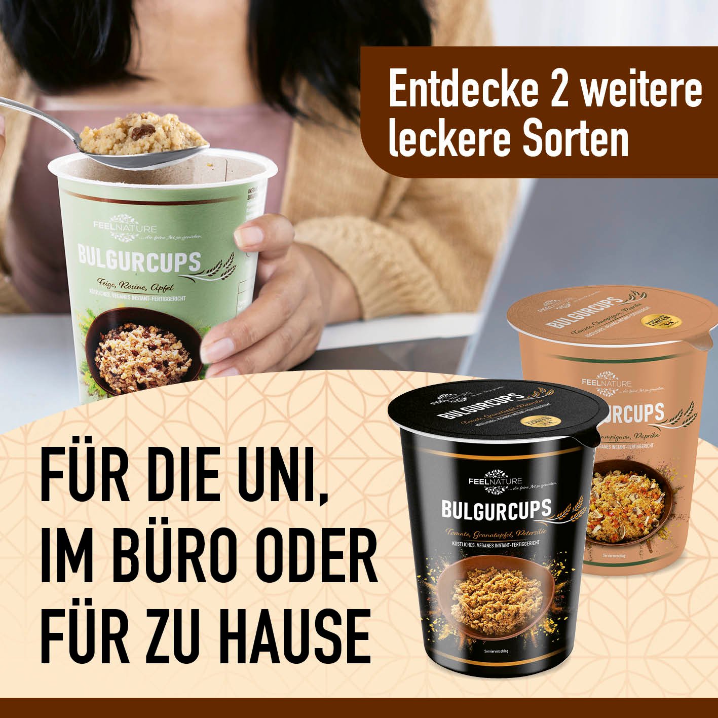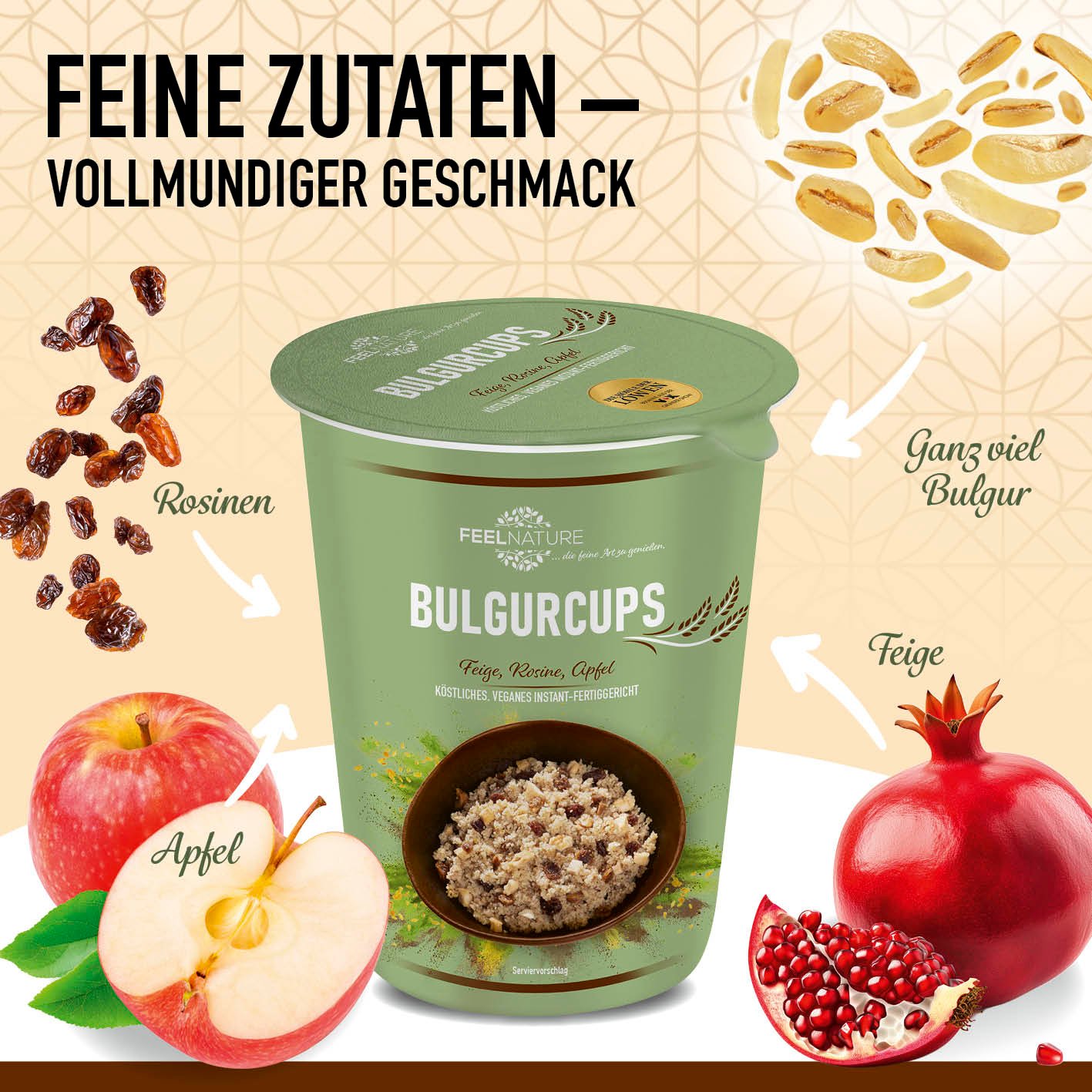 - EINZIGARTIG & LECKER – Entdecke die exotische Frische der FEEL NATURE Bulgur Cups in der Subtropical-Variante! Diese einzigartige 5 min Terrine kombiniert den nussigen Geschmack von Bulgur mit der süßen Frische von Feigen. Rosinen und knackigem Apfel.