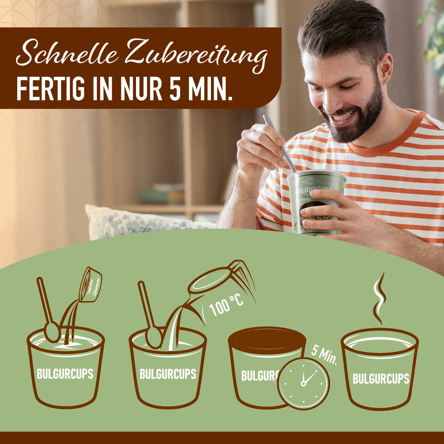 - GANZ EASY – Einfach den Deckel abnehmen. die Sauce herausnehmen. unterrühren und mit 80 ml kochendem Wasser auffüllen. Schon bist du nur noch 5 min von deinem köstlichen Bulgur-Gericht entfernt – perfekt für unterwegs oder den schnellen Hunger zwischendurch!