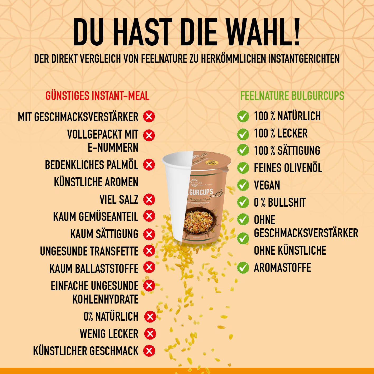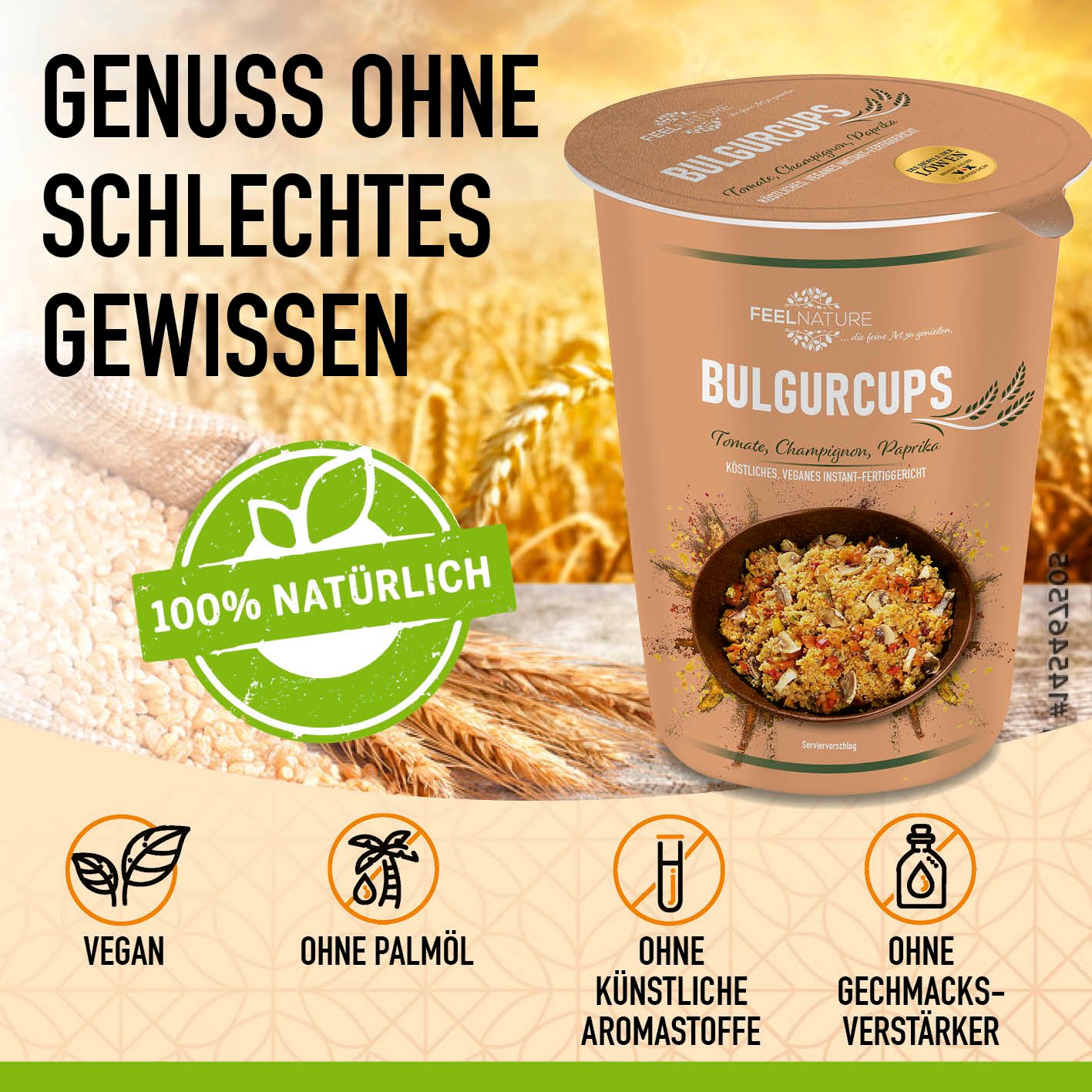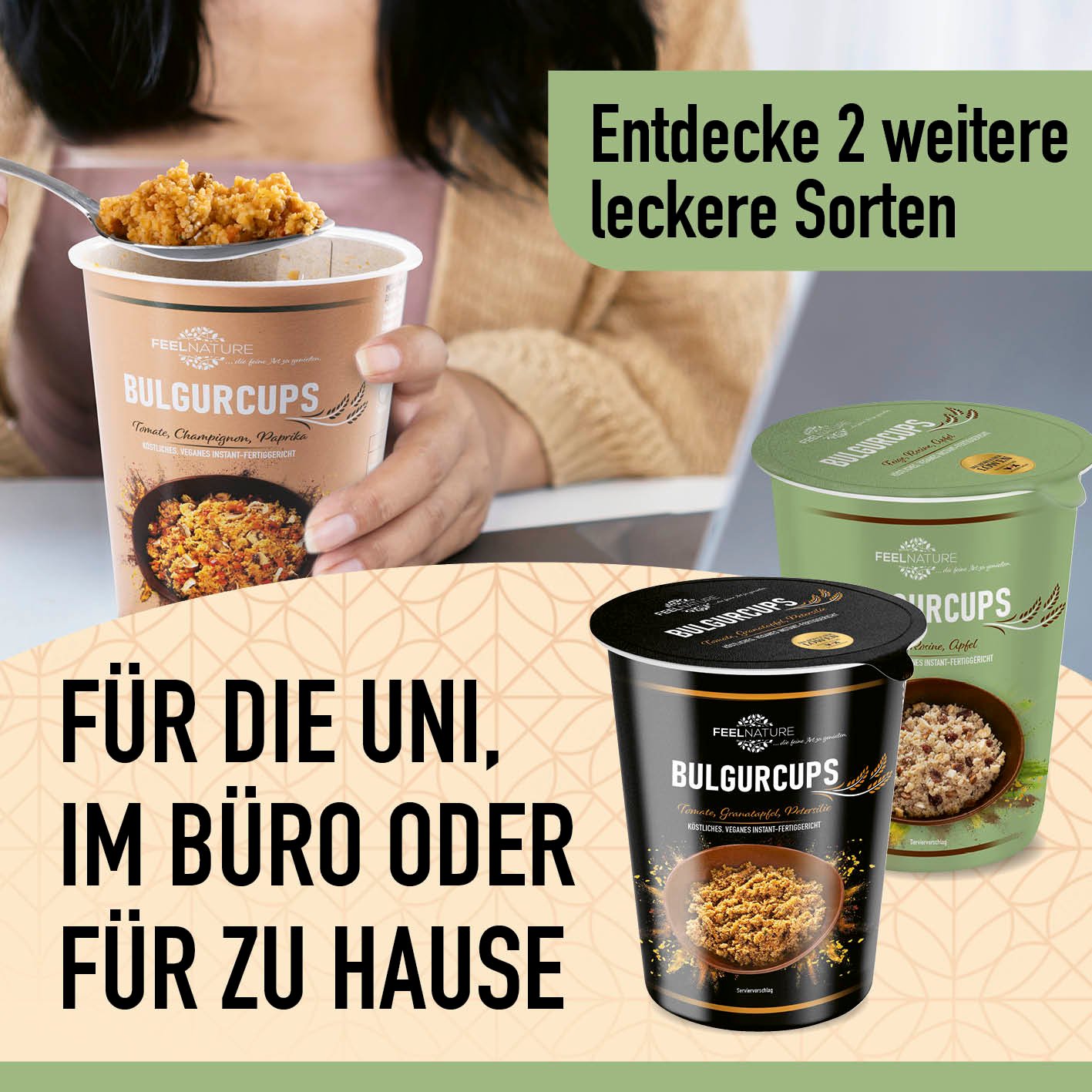 - EINZIGARTIG & LECKER – Genieße das leckere Gemüse der FEEL NATURE Bulgur Cups in der Vegetables-Variante. Tomaten. Champignons und Paprika verleihen dieser einzigartigen 5 min Terrine einen aromatisch-runden Geschmack. der sich perfekt mit dem nussigen Bulgur ergänzt.