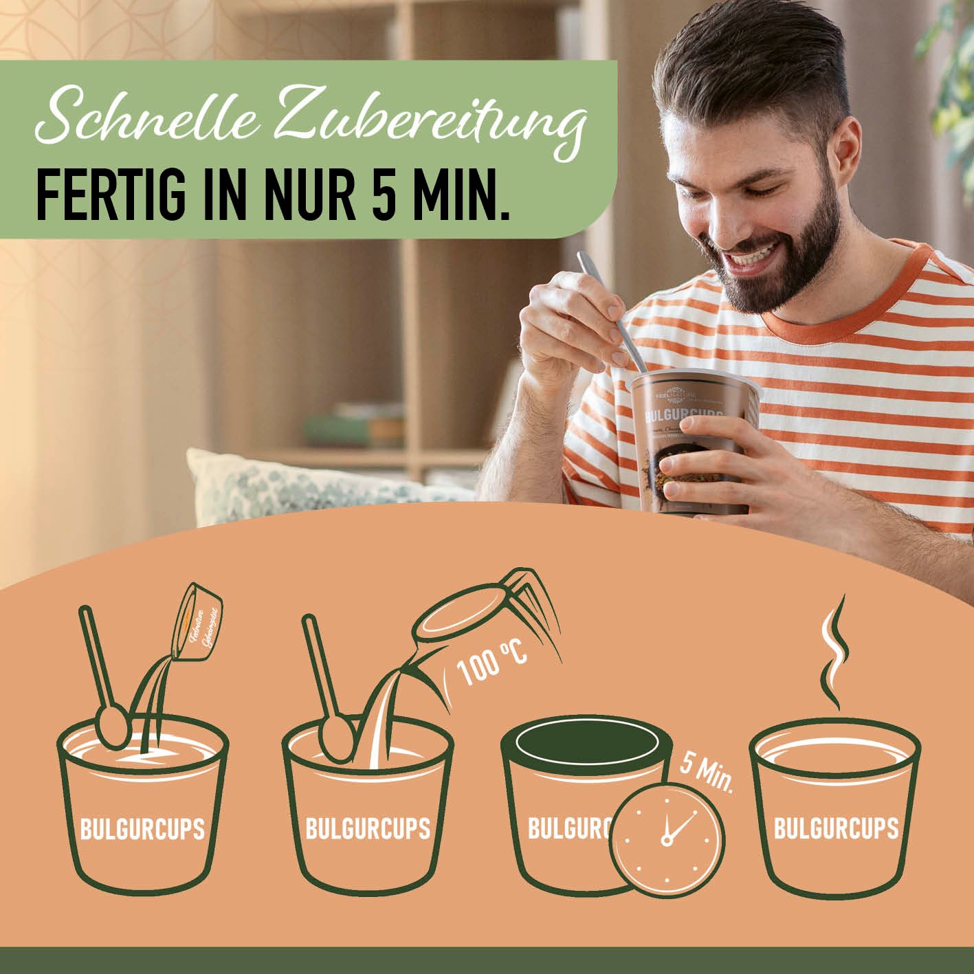 - GANZ EASY – Einfach den Deckel abnehmen. die Sauce herausnehmen. unterrühren und mit 80 ml kochendem Wasser auffüllen. Schon bist du nur noch 5 min von deinem köstlichen Bulgur-Gericht entfernt – perfekt für unterwegs oder den schnellen Hunger zwischendurch!