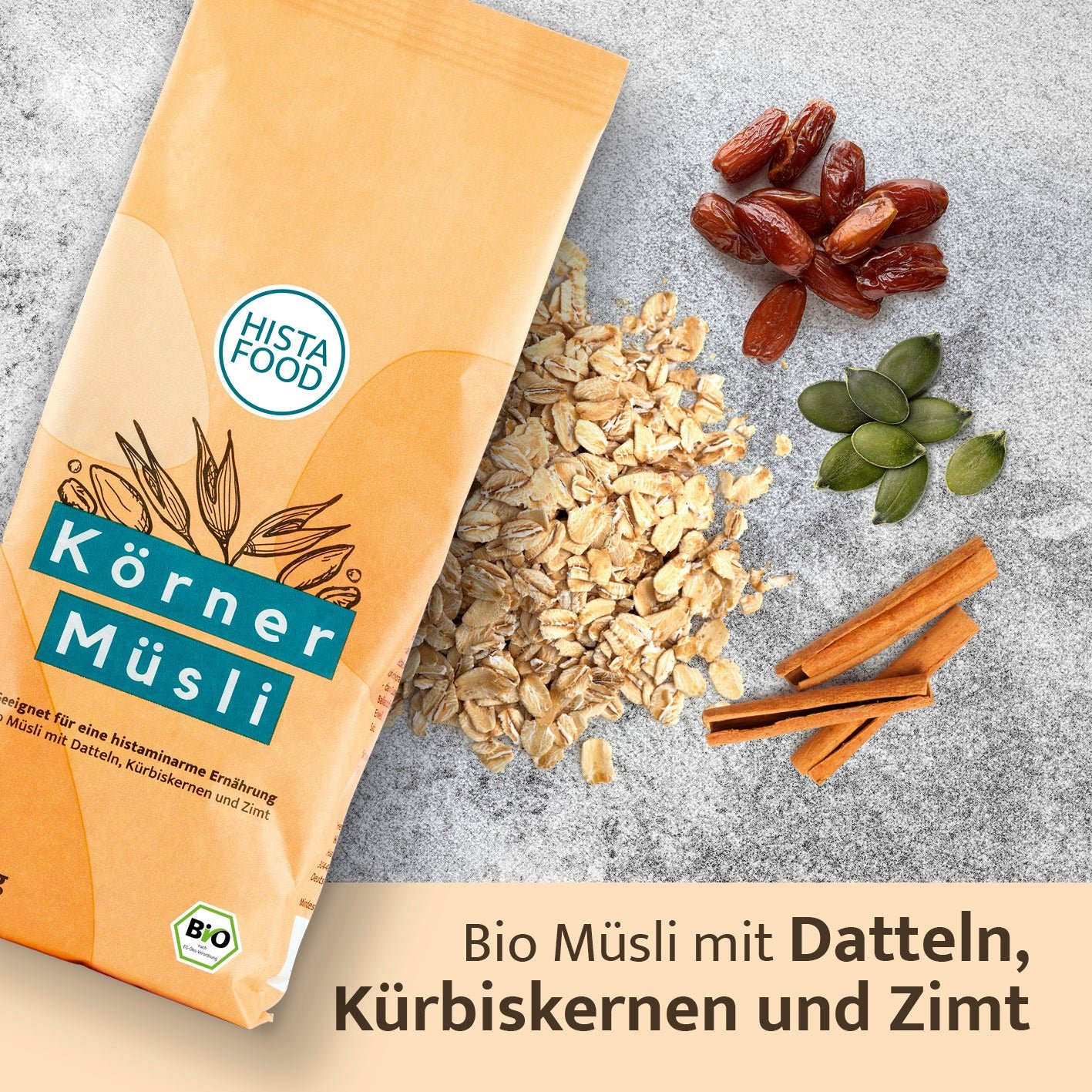 - Bio-Müsli mit Datteln. Kürbiskernen und Zimt